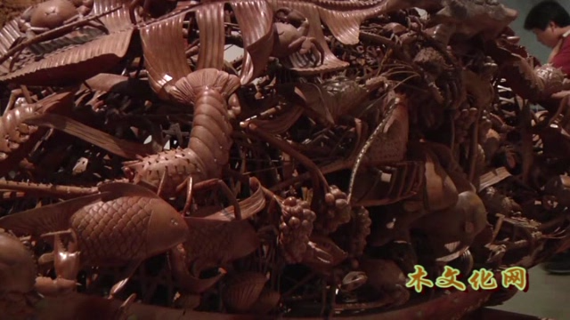 杨坚平:潮州木雕除了做这类螃蟹以外还有人物,传统人物用多层次的形式来表现。潮州木雕的艺术表现形式是一块木材通过细致的表现, 以当时的手法来刻画历史人物,非常有特色,因此很多美术师、艺术家对它的评价非常高,从明代到清代是潮州木雕的繁荣时期。现在我们看到的这个作品只是一种形式,这类的摆件作品在改革开放以后创造出来,成为一种大型的,可以欣赏的作品。
