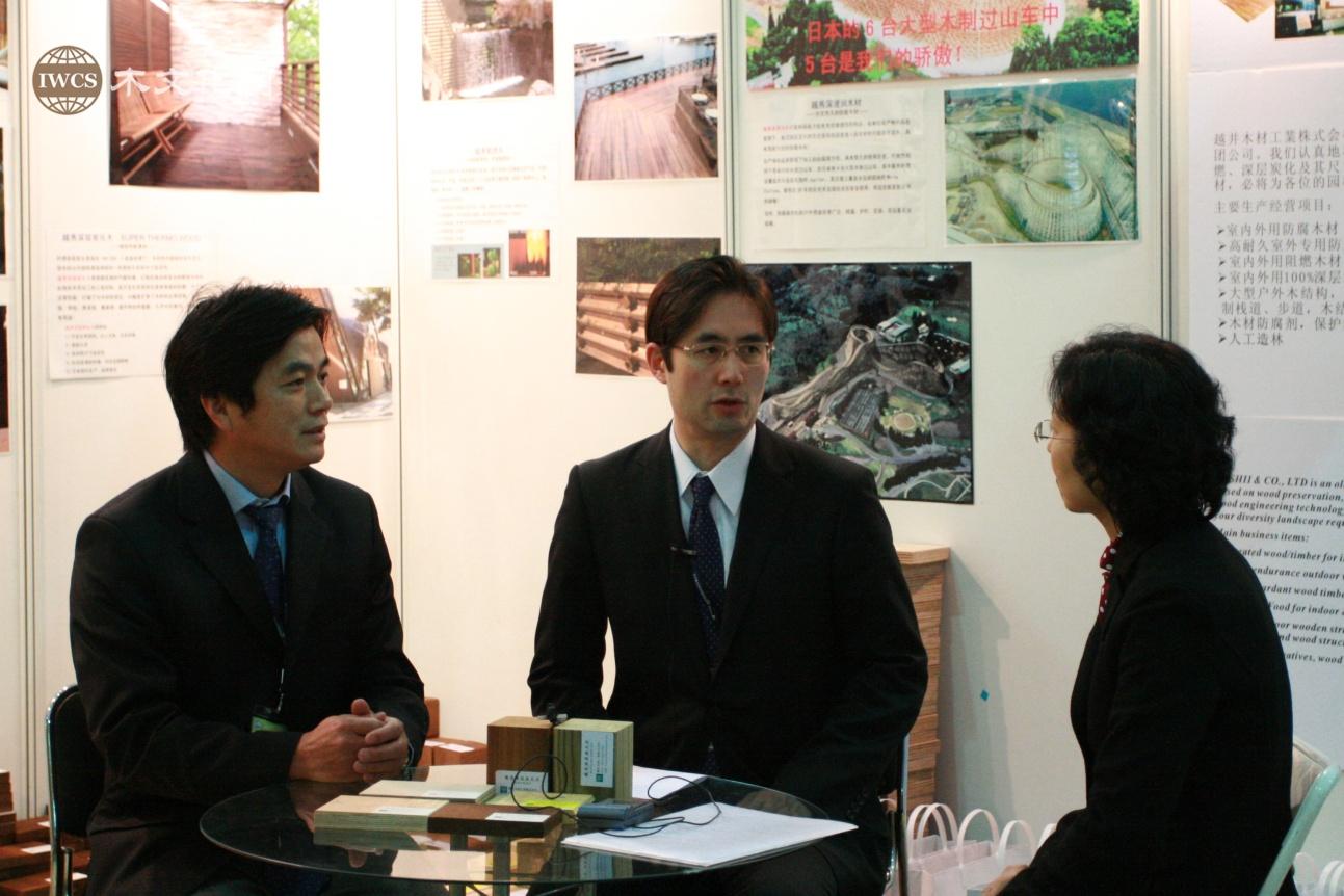 嘉宾:我们来自日本,我是越井木材工业株式会社社长越井润,另外介绍下我的成员,这位邱先生是中国市场开拓司的司长、责任者,已经来日本二十多年了,此外,敝司参加这次展会的还有小魏、小武、小方。