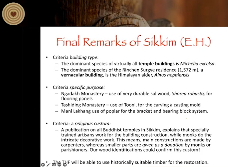 As for the Eastern Himalayas Mechtild Mertz investigated five temples and one vernacular house in the Indian country of Sikkim in order to understand, which wood species were used, as for the Western Himalayas she studied the wood species also of five temples, two stupas and three vernacular houses.