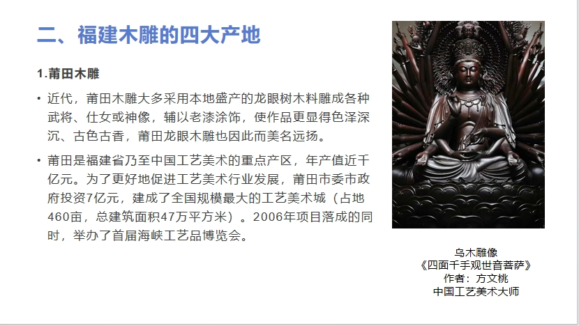 福建木雕的传承与发展现状 2023/11/231,263 论坛名称:2023传统木雕的传承与创新论坛 论坛时间:2023年9月29日 论坛地点:福建·莆田 报告嘉宾:李惠英 福建省工艺美术协会会长、木雕专委会主任 报告内容: 简要介绍了福建木雕四大产地的传承,包括莆田木雕、福州木雕、建瓯木雕和泉州木雕的发展情况,并对木雕“技艺传承”与“创新发展”提出了从业者要认真思考和践行,福建木雕艺术只有准确把握住时代的机遇实现文化产业的升级转型,才能最终实现福建木雕的产业化和规模化。 责任编辑:iwcs2392H 翻译 搜索 复制