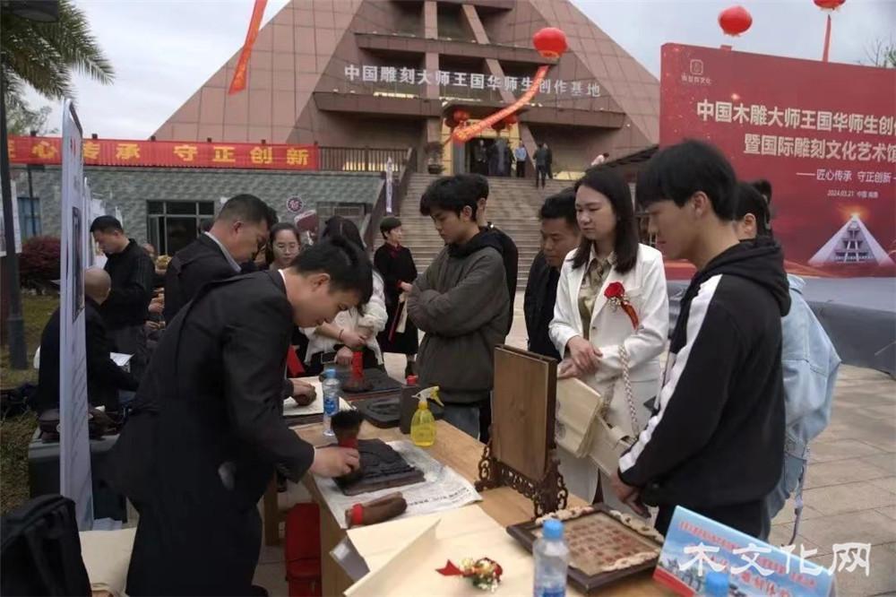2024世界木材日中国响应活动于3月21日在江西南康家居小镇举行。本次活动由国际木文化学会和国家林业和草原局木文化创意产业国家创新联盟指导,江西南埜木文化有限公司主办,活动包括木雕大师王国华师生创作基地周年庆典、国际雕刻文化艺术馆开馆、植树和民俗体验四项内容。相关单位领导、业界工艺美术大师代表、行业协会和产业界代表、当地学生学徒代表等出席活动。庆典仪式结束后,与会嘉宾参加了庆祝“2024世界木材日”植树活动,在草坪上种植了一棵罗汉松和十棵红花继木,共同为这片艺术土地种下了新的生命。活动现场还举办了宁化活字印刷、手工筷子制作、非遗雕刻等民俗表演和体验活动,让观众亲身感受到了非遗传统技艺传承的厚重意义。