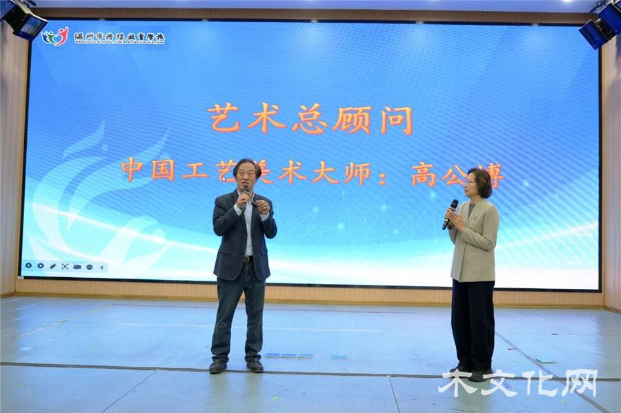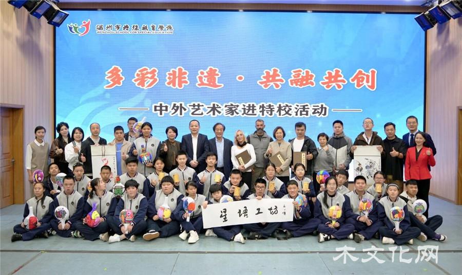 11 月 4 日,温州市特殊教育学校三楼多功能厅木艺飘香,“多彩非遗・共融共创 —— 中外艺术家进特校活动” 温情启幕。国际木文化学会秘书长苏金玲、中国工艺美术大师高公博,希腊艺术家乔治斯・阿萨纳萨基斯、塞浦路斯艺术家安特里・帕菲蒂及温州非遗大师代表,与该校近百名师生共赴跨国非遗盛宴。活动由曾友峰主持,程页川、金阿亚分别提供英文与手语翻译,确保文化心意无障碍传递。
