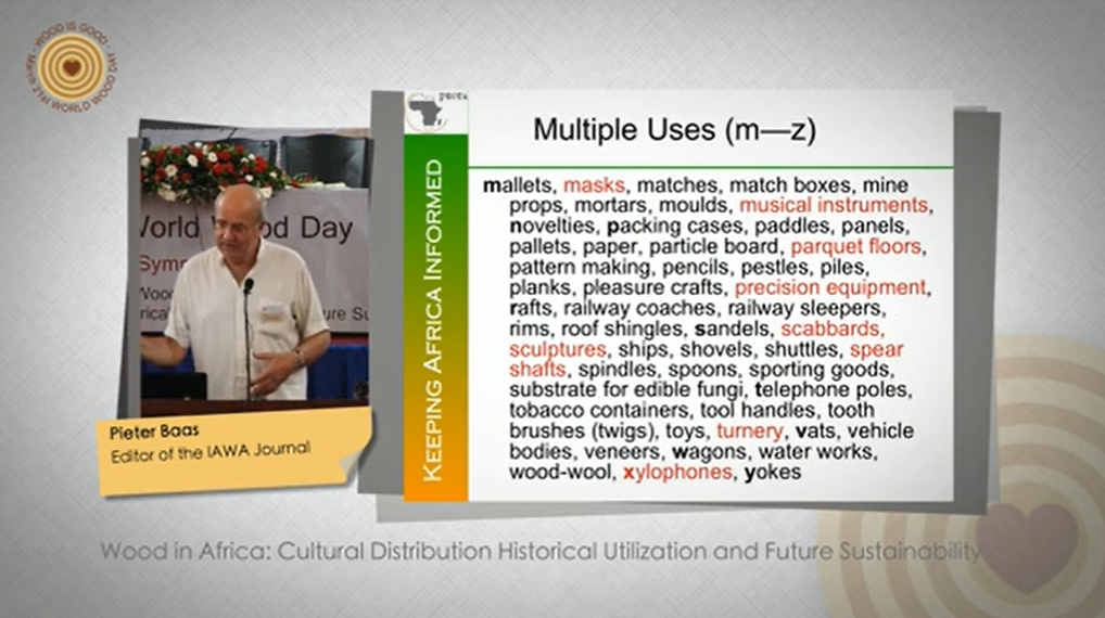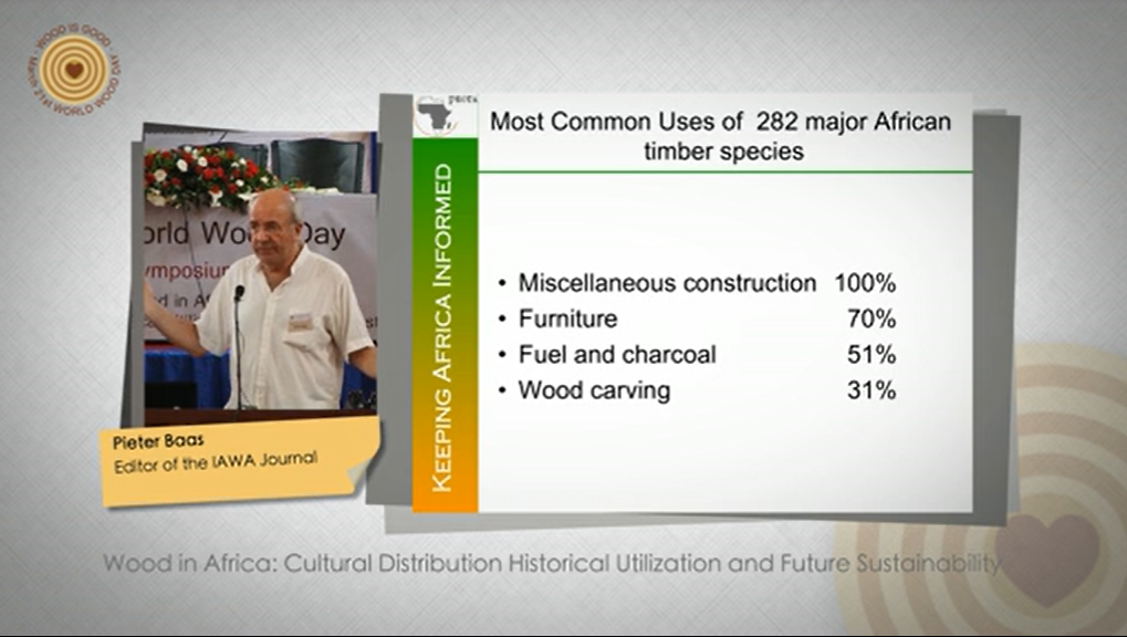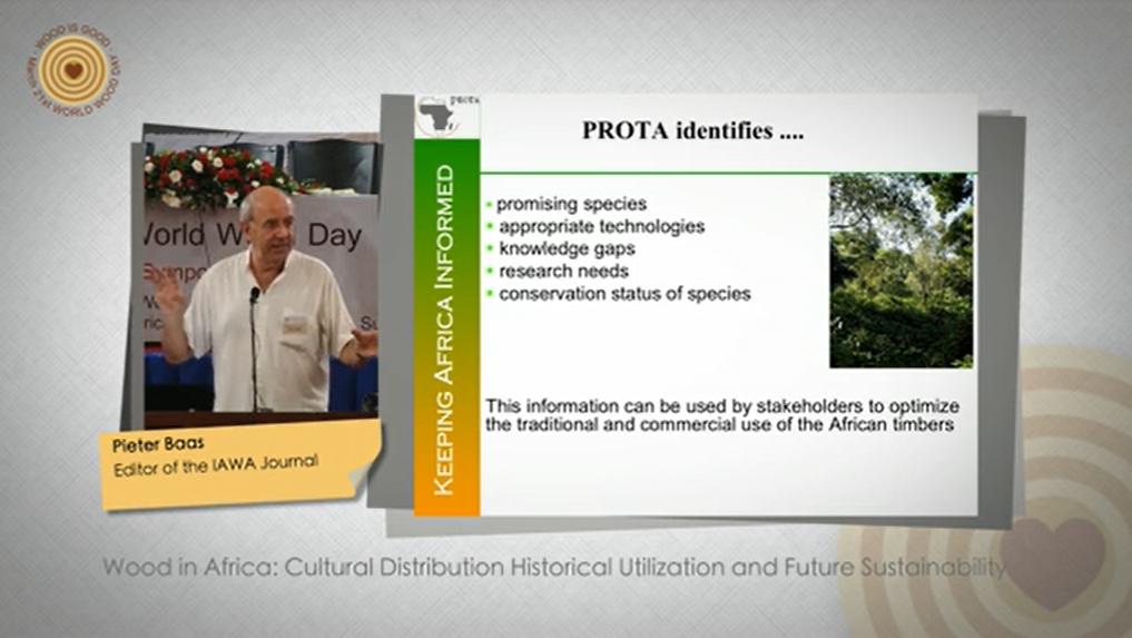 The PROTA Handbooks 7 (1 & 2) on about 1200 commercial timber species from Tropical Africa (Plant Resources of Tropical Africa, see also www.prota4u.org) contain a wealth of information on over 1200 indigenous and cultivated tree species. Although most information in the handbooks is derived from published information, the data on wood anatomy were gathered in two workshops in Montpellier, France (2007) and Kumasi, Ghana (2010) by young African wood scientists and a team of international senior wood anatomists. The resulting information is of great value for wood identification (in the service of wood culture, wood trade, and implementing legislation to combat illegal logging), tree biology, silviculture, forest dynamics and for wood quality research. In this talk I will give some examples to underpin this general statement. Information of the many uses of certain timbers for construction material, for carving, charcoals, pulp and paper and multiple traditional applications invites further analyses so that alternative species can be suggested for similar end-uses.