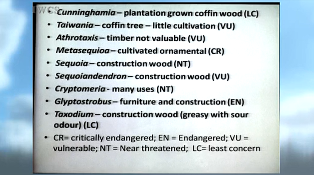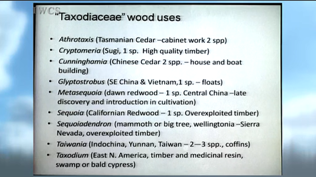 Several former Taxodiaceae are iconic and majestic trees in their natural distribution area. Many are also highly endangered, mainly through overexplotation in the past of their even-grained low- to medium density timbers. Their greatest promise for wood culture today and in the future is as a source of timber from plantation grown stock or as much enjoyed trees in nature reserves and as park or roadside trees.
