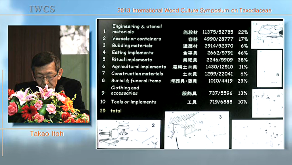 Abstract: Japanese cedar is an endemic species and only domestic species among Taxodiaceae in Japan. It is distributed widely in Japan peninsula except Hokkaido district and the most abundantly planted tree species for the commercial purposes in Japan at present. Recently, we have published a database of wood species used for archaeological wood excavated in Japan(Itoh et al., 2012). According to the database, the most frequently used wood was Japanese cedar, followed by Castanea crenata (2nd), Quercus sp., Sect. Prinus (3rd.), Chamaecyparis obtusa(4th), Quercus sp. Sect. Cerris (5th), Fraxinus spp. (6th), Quercus sp. subgen. Cyclobalanopsis (7th), Abies spp.( 8th), Aesculus turbinata (9th), and Zelkova serrata (10th). Therefore, Japanese cedar is the most useful tree in the history of Japan. On this occasion, utilization of Japanese cedar for the other wooden cultural properties such as Buddhist sculptures, temple and folk houses will be presented.