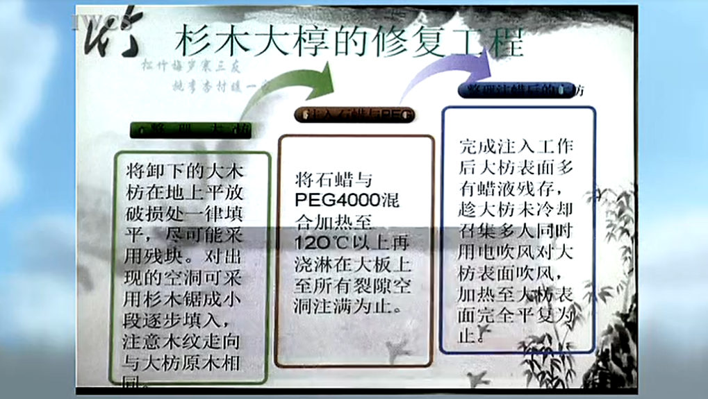 但是大椁出土后并未保存好,为了应付因好奇而涌来的成千上万的观众,大椁未作干燥即拼装用于展览。十多年后,它们严重朽蚀。九十年中拟去台湾展出,因不堪迁移而作罢。一九九八年我们成功的修复加固了大椁,保证了大椁的跨海之行,大椁和上百件马王堆出土文物将西汉文明之风吹到了台湾。