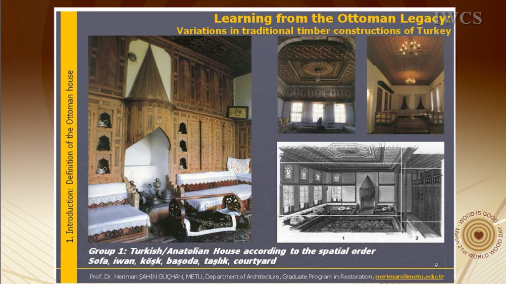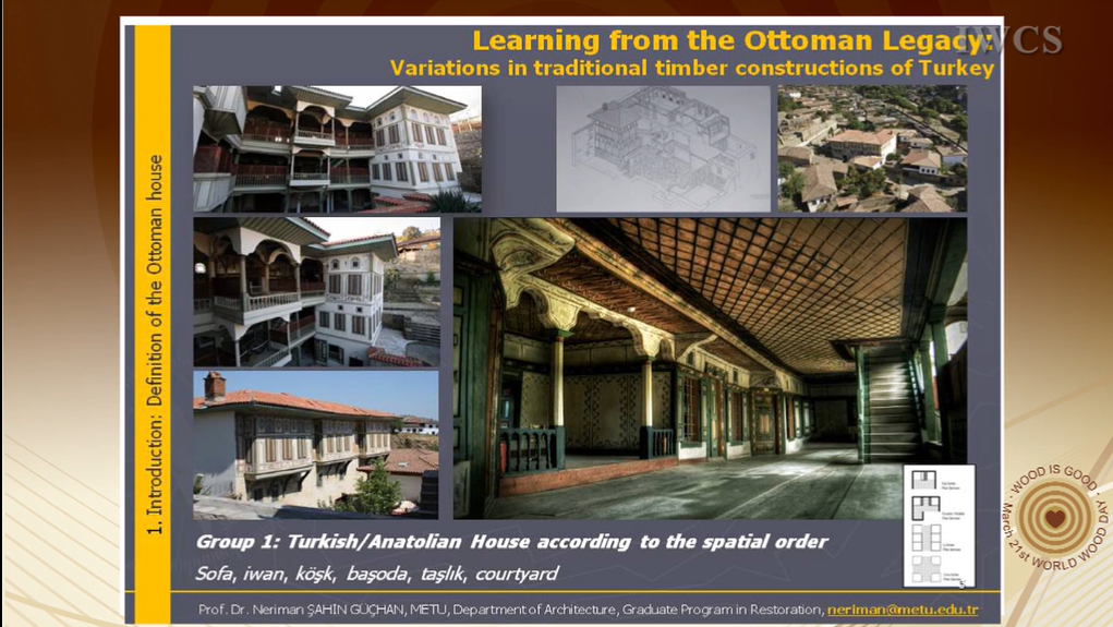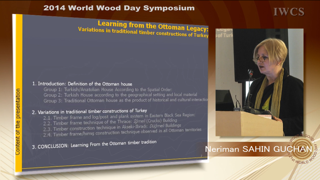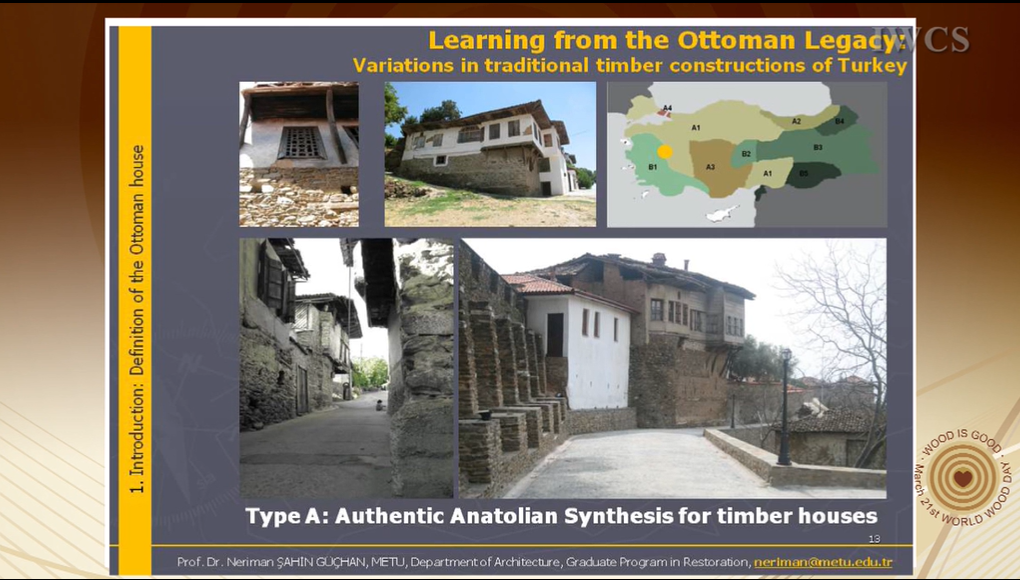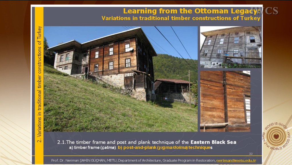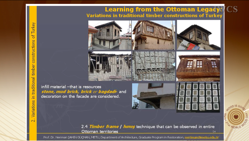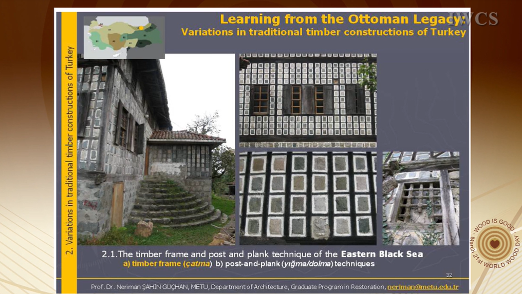 The first section explores the regional differences in housing tradition, developed according to local features and defined by architectural features, material characteristics and availability of materials. Derived from these regional differences in the second section, variations in traditional timber construction systems in Turkey are given with special emphasis on Ottoman half-timber frame (hımış) system. In this part besides the hımış technique, which expanded all over Ottoman land from Balkans to Syria, timber masonry and frame systems in Eastern Black Sea Region and Thrace are given in detail with visual documents.