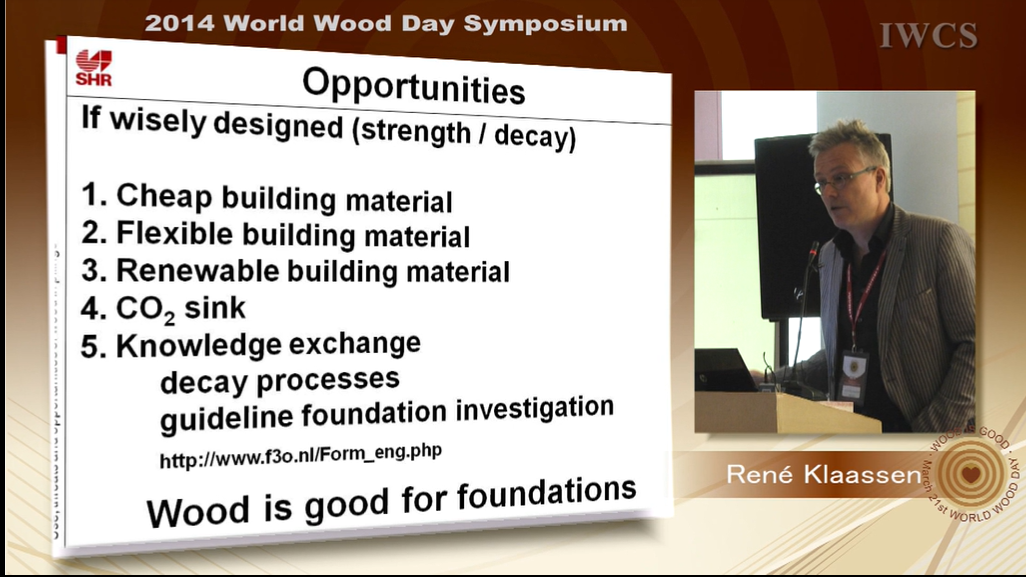 My presentation advocates the need to better explore the possibilities and limits of using wooden pile foundations. First, a summary is given on the history of the use of wooden foundation piles in Europe and especially in the Netherlands, then actual problems with wooden pile foundations are described and possible causes are discussed. Finally, opportunities are stressed to apply wooden pile foundations in future.