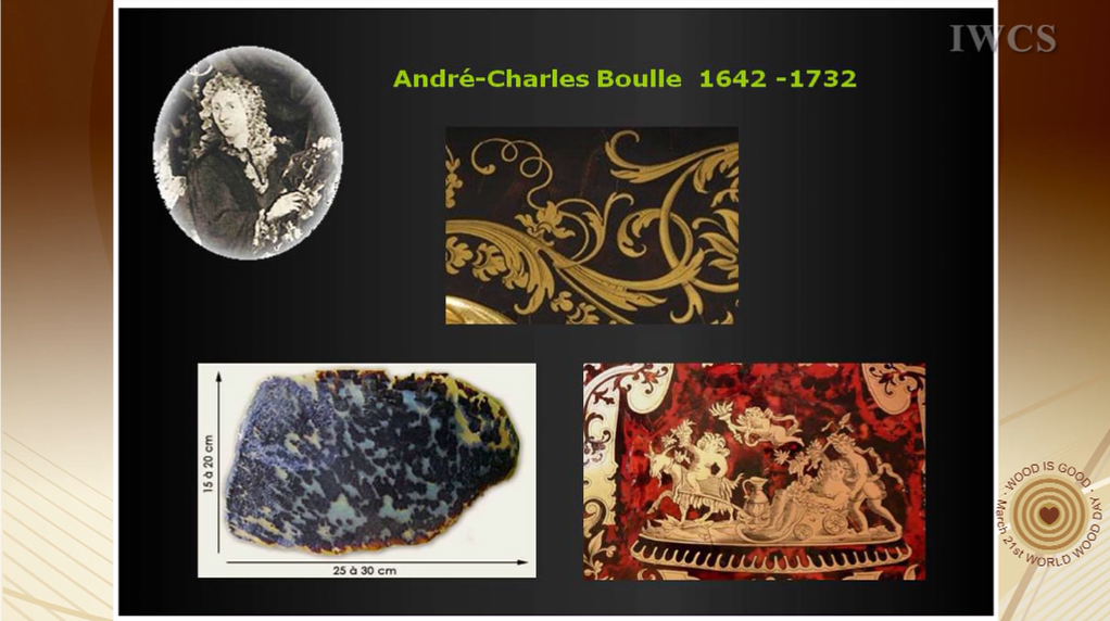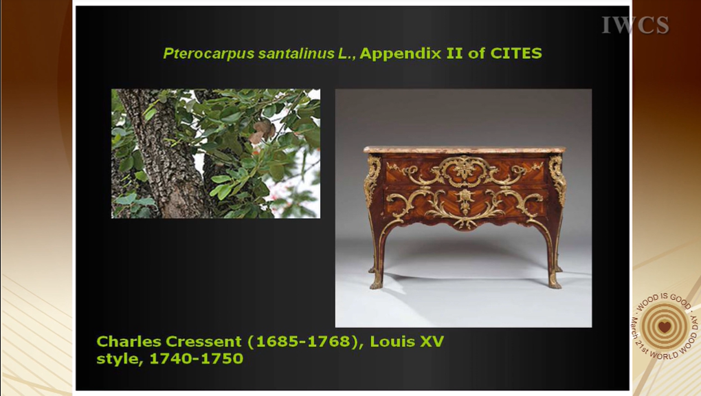 In the second half of the Eighteenth century, between 1751 and 1772, was published in France the famous Encyclopédie, edited by Diderot and d'Alembert. The purpose of this encyclopedia was to gather knowledge and expertise in all areas, but also to popularize the latest advances in science and technology. In this context appeared in 1774 “The Art of cabinetmaker” (L’Art du menuisier ébéniste), written by the master carpenter André Jacob Roubo. Because of its quality, this book was for a long time a reference for carpenters and cabinetmakers. We can recognize some of the species recorded in that book (but without the Latin binome, which was only known at that time by few naturalists) and today endangered.