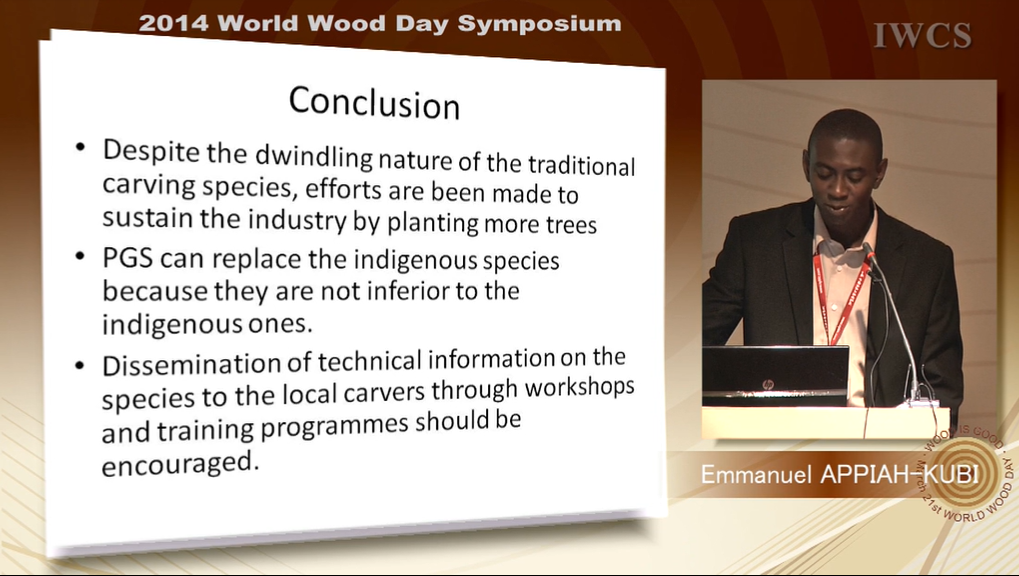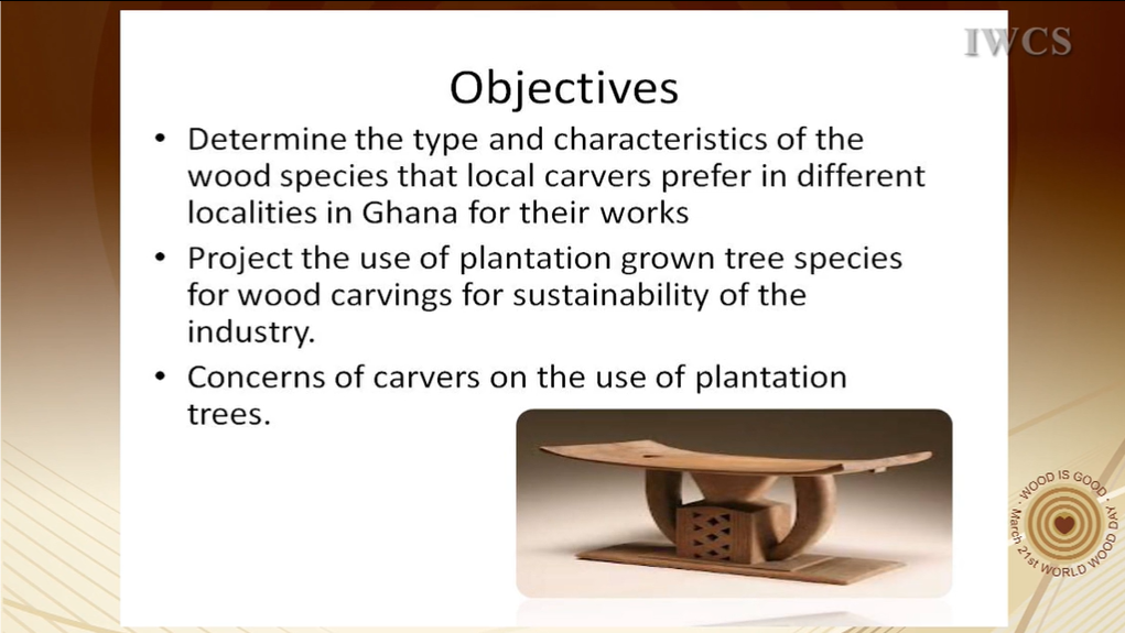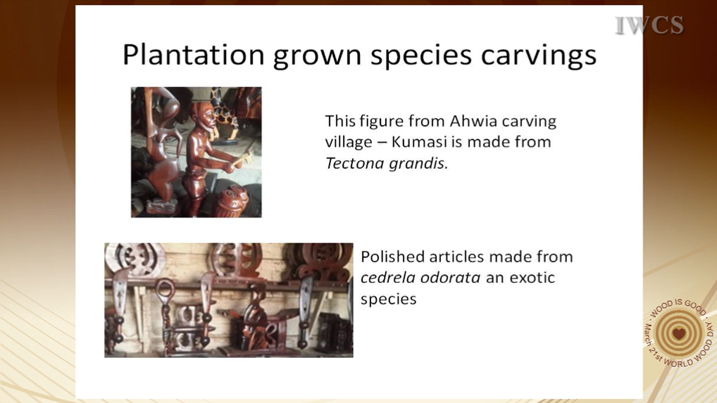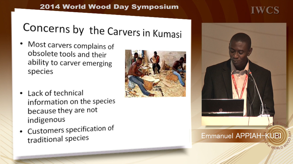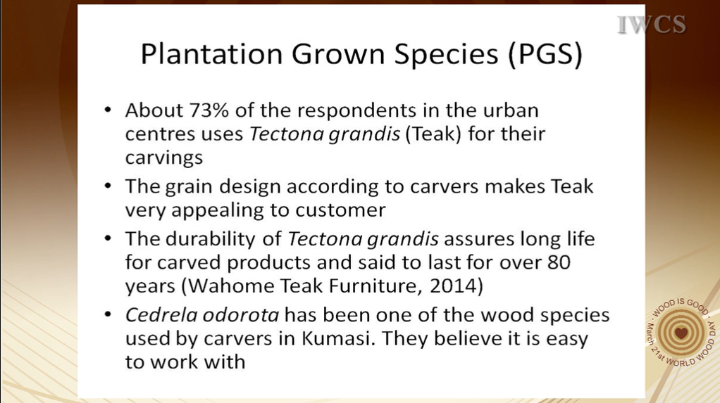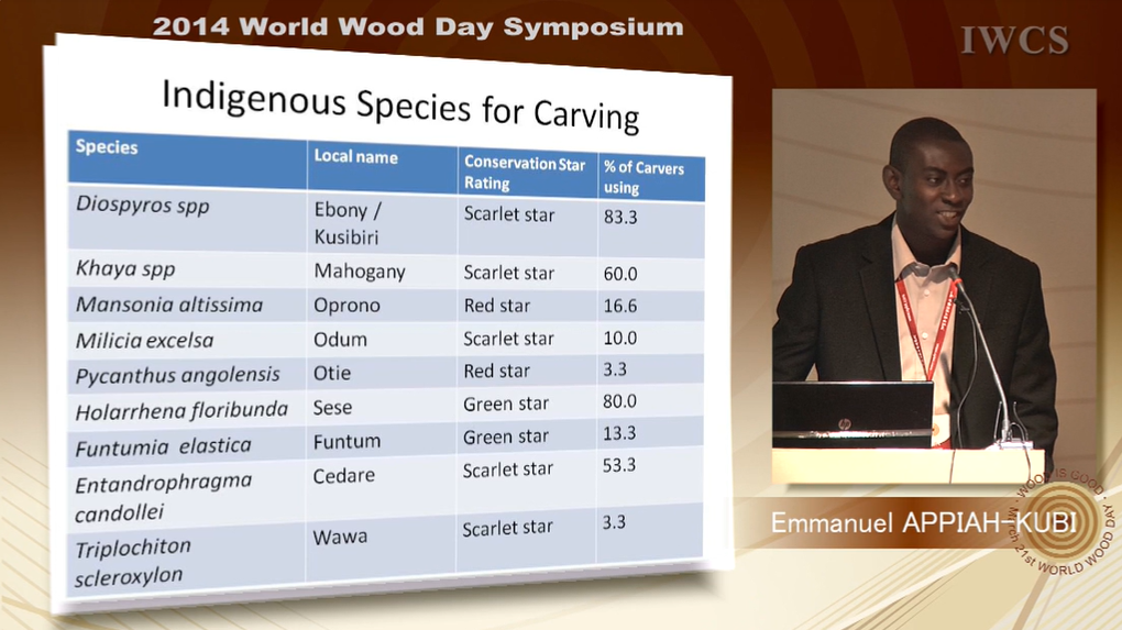 Training workshops should be organized for wood carvers in the country to improve their skills and also prepare them to use other lesser known and plantation grown tree species in place of the more popular ones in order to sustain the carving industry.