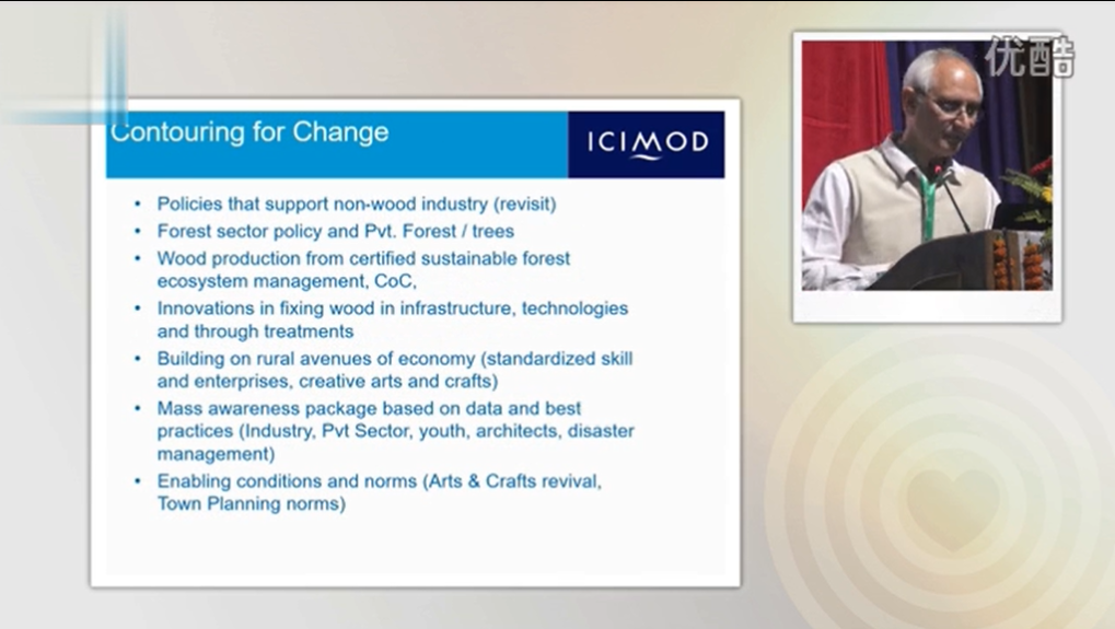 报告简介: Rajan Kotru先生分享了如何在文化、保护以及气候中进一步利用木材的观点。在报告中,他以兴都库什喜马拉雅山脉为例,讲述了遗产、科学、手工艺以及信仰之间的联系。在总结中,他提出了诸如颁布相关条件和规范,创新使用修复基础设施中的木材等建议。