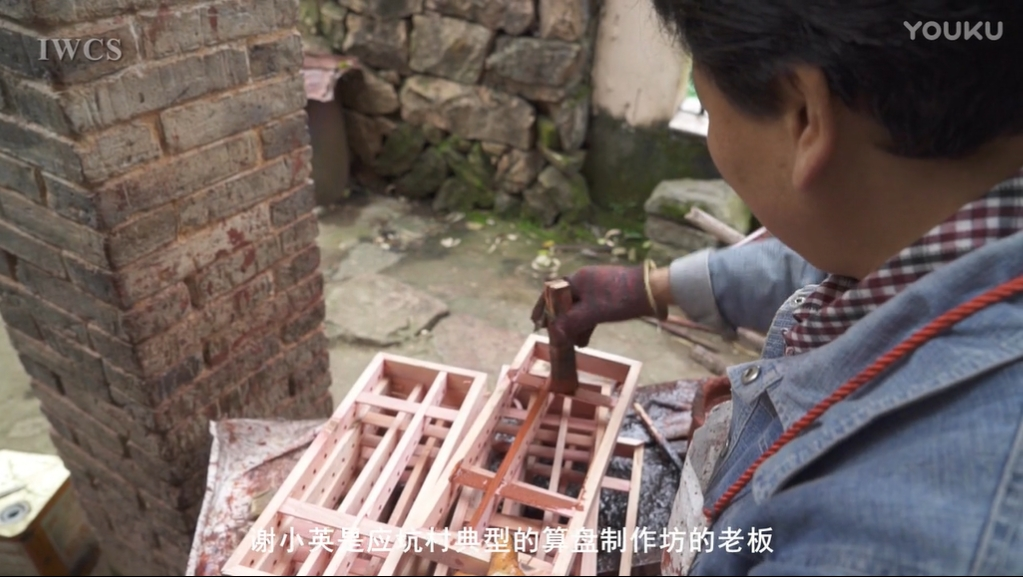 四十多岁的陈建荣以前是做家具的木工师傅,现在和妻子一起来到亲戚谢小英家制作算盘。夫妻两人配合默契,一天可以做两百个算盘。他们制作算盘使用的塑料珠子是从其他地方买来的成品,中间使用的竹竿来自江西。外面的木框是谢小英作坊里的主要加工对象。制作木框的材料从山上采伐,一般使用材质偏软,成本较低的松木。硬木制作的算盘更加美观,但因成本较高,市场销路不如松木算盘。