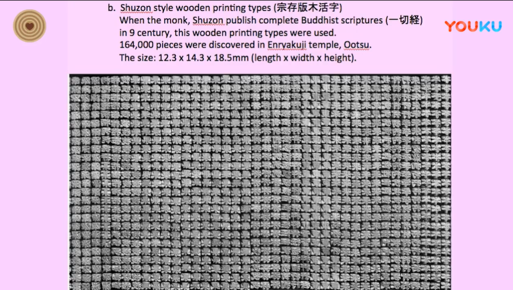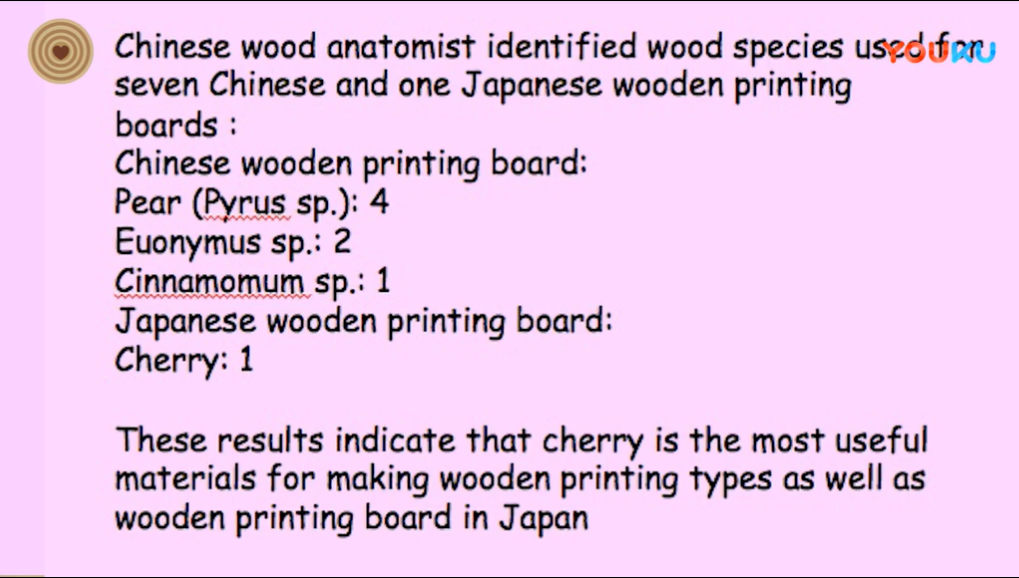 China and Japan are two major countries which cultivate culture of Chinese characters (“Kanji culture” in this presentation) in the world. The “Kanji culture” has been greatly diffused in Yedo era (starting from 1603) in Japan by the development and frequent uses of wooden printing types in place of wood plate for printing Buddhist scriptures. Up to the present, three major wooden printing types have been discovered in Japan; that is, (a) Fushimi-ban, (b) Shuzon-ban and (c) Tenkai-ban wooden printing types. “a” was donated to Enko-ji temple, Kyoto by Shogun Tokugawa Ieyasu in Yedo era and 52,000 pieces of the wood printing blocks were found in the temple; “b” was used for printing “complete Buddhist scriptures” in Yedo era and 164,000 pieces were found in Enryaku-ji temple, Shiga; “c” was used for publishing “complete Buddhist scriptures” in Yedo era and 260,000 pieces were found in Kanei-ji temple, Tokyo. Fortunately, the speaker had opportunities to identify wood species used for these wooden printing types. In “a”, 78 wood printing types were provided for wood identification and 77 were identified as Cerasus sp. (Cherry tree) . In “b”, 92 wood printing types were examined for wood identification and 77 pieces were identified as Cerasus sp. In “c”, 200 wood printing types were examined for wood identification and 192 pieces were identified as Cerasus sp. Cherry wood was the best species for wood printing types and contributed to the diffusion of “Kanji culture” in Japan.