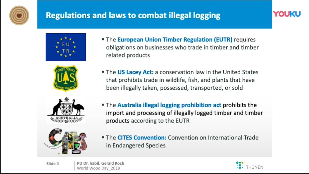 As a contribution to global forest protection international laws and timber regulations are enacted, such as the USA Lacey Act, the European Timber regulation (EUTR) and, the Illegal Logging Prohibition Act in Australia. All these regulations prohibit the import and trade of illegally logged wood and require that timber and timber products have to be produced in accordance with the respective national legislation. Controls are based on a due diligence system which requires the correct declaration of the wood genus/species (botanical name) and origin.