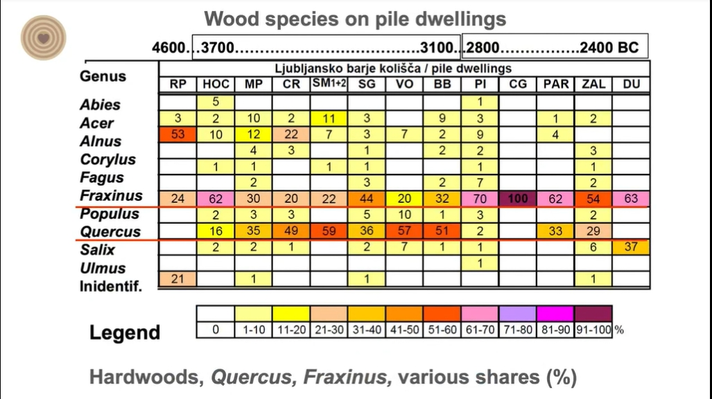 In Slovenia currently 58% ofthe area is covered by forests. Predominating wood species are European beech(Fagus sylvatica), Norway spruce (Picea abies), European silver fir (Abiesalba) and oak (mainly Quercus petraea and Q. robur) and their shares in thewood stock are 32, 30, 7 and 7% respectively. Results of our investigationsshow that availability and use of different wood species largely varied in timeand space. In prehistoric pile dwelling sites at the Ljubljansko barje, 99% ofthe investigated wood belonged to 10 hardwood species, and the proportions ofoak and ash (Fraxinus excelsior) were the highest. Wood species in ancientRoman constructions were mainly oak, silver fir and beech. Various up to500-year old constructions in SE Slovenia were mainly made of oak, whereassilver fir became more frequent in the 18th century and Norway spruce in the19th century. In the NW Alpine region mainly conifers with varying shares oflarch, silver fir and Norway spruce were used. In the coastal region most ofthe wood for building was imported and the choice of wood species varied inagreement with socio-political situation which influenced the timber trade.