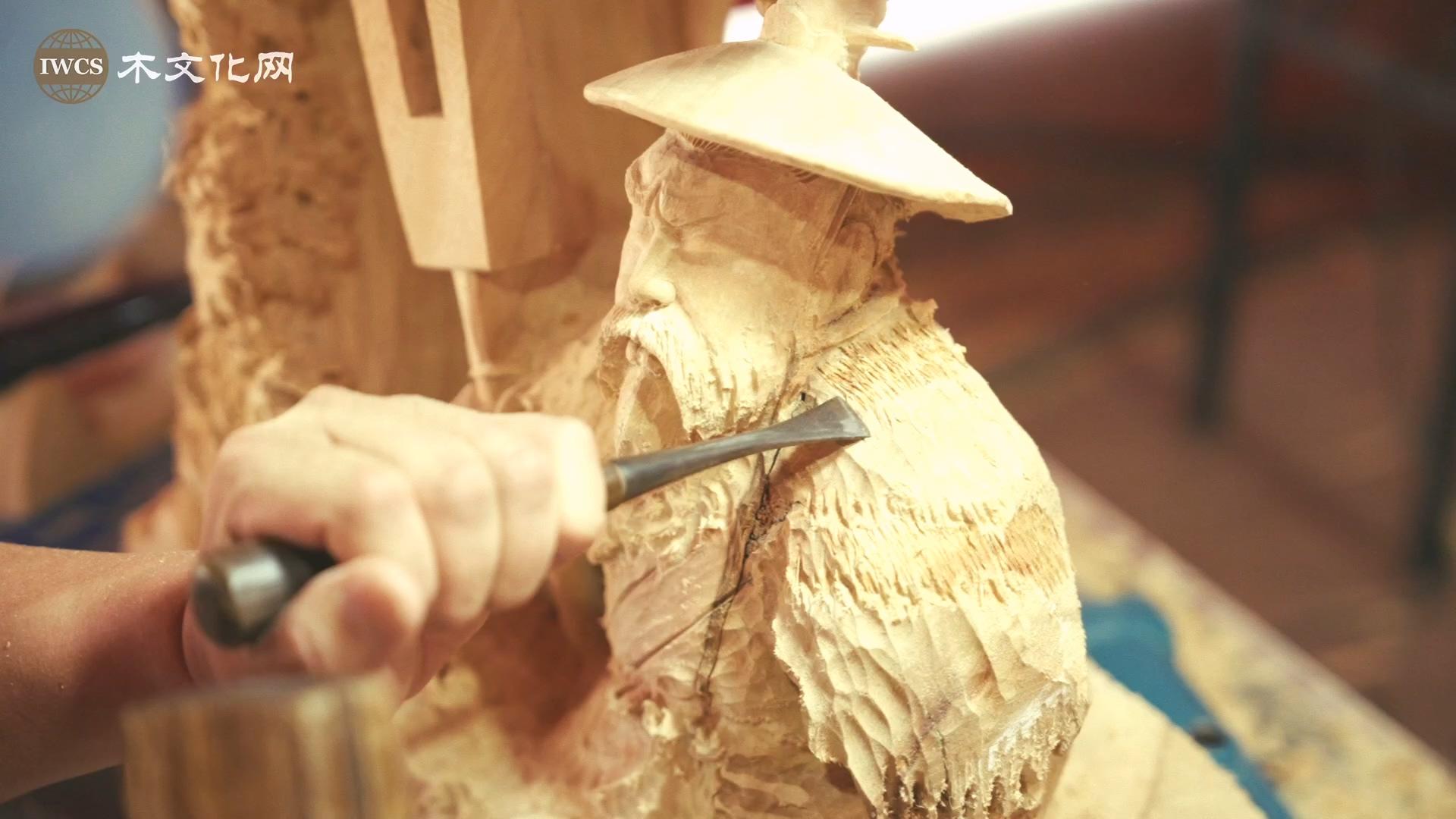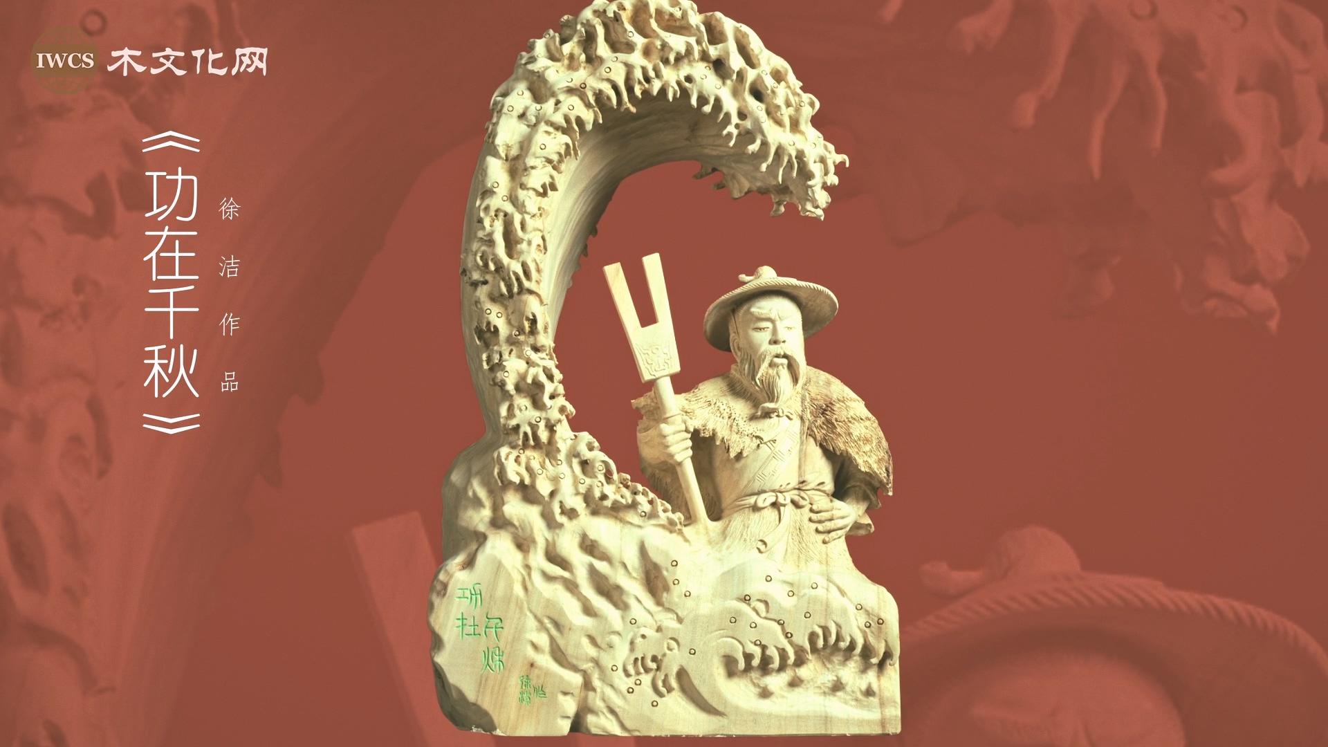 作品简介:作品以中华民族治水故事为题材,刻画了大禹的形象和洪水滔天的浪花场景。创作时注重造型、创意与创新的结合,通过动静对比营造视觉冲击力。技法上融合镂空雕、圆雕,并运用独创的"乱刀法"表现蓑衣的层次感,展现了木雕艺术的创新表达。